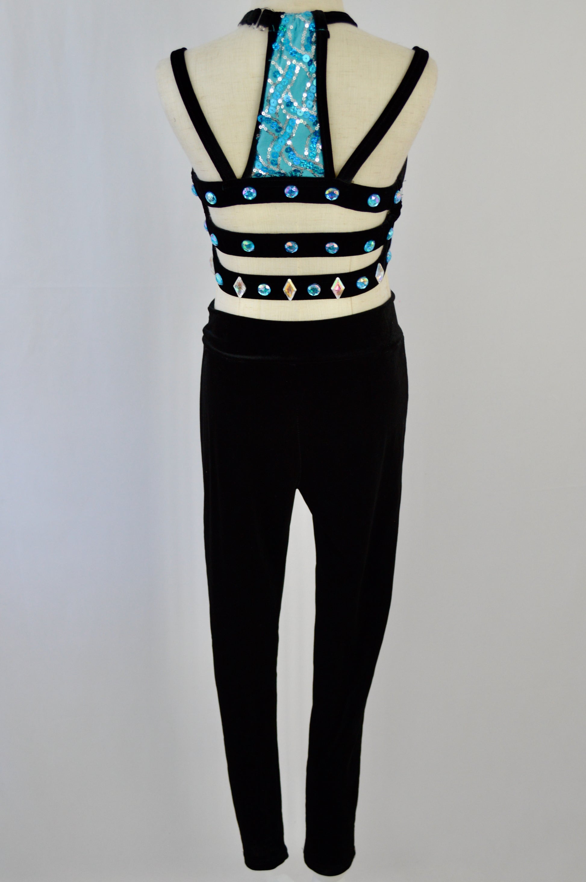 - large rhinestones on black velvet straps across back