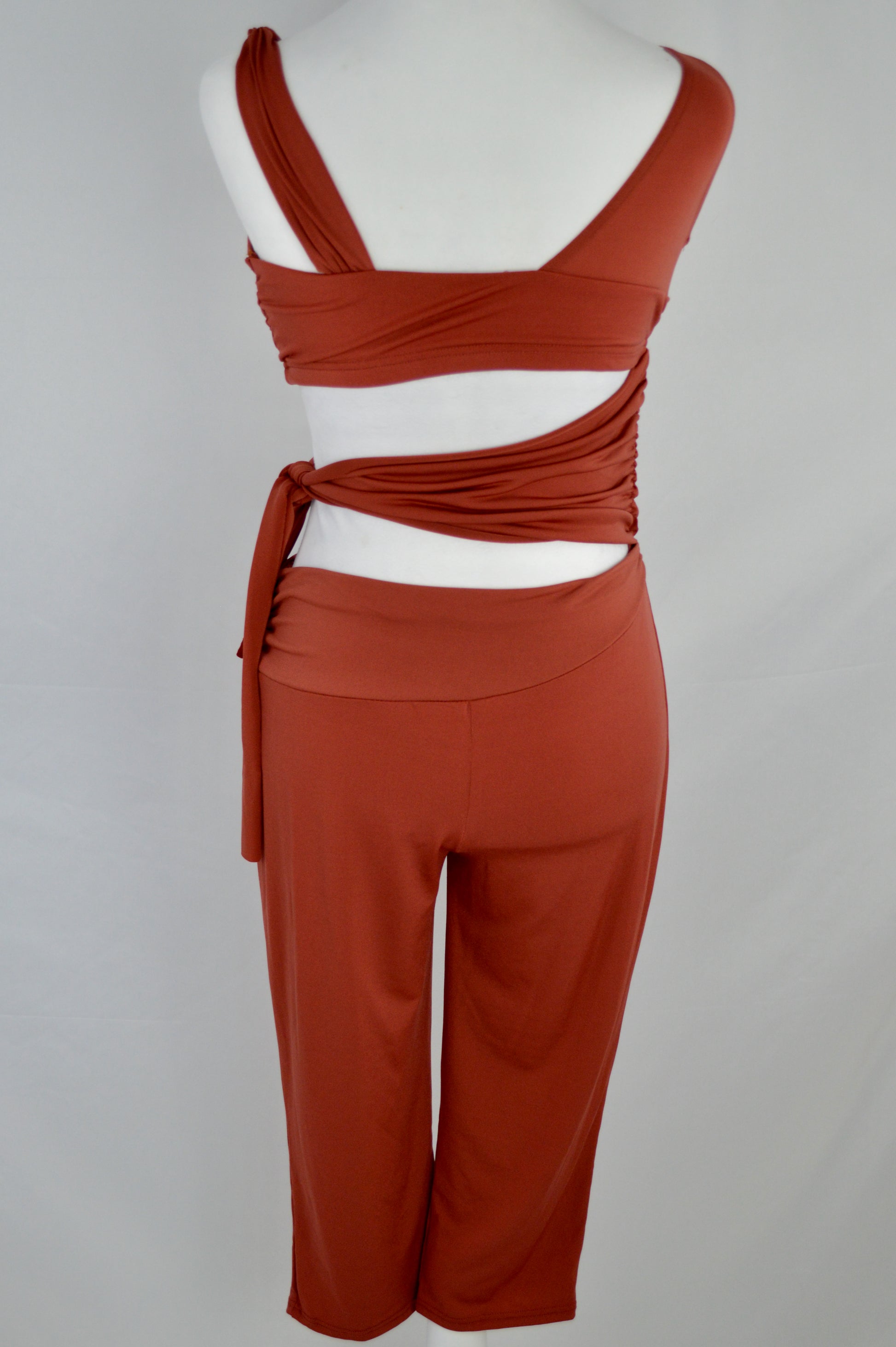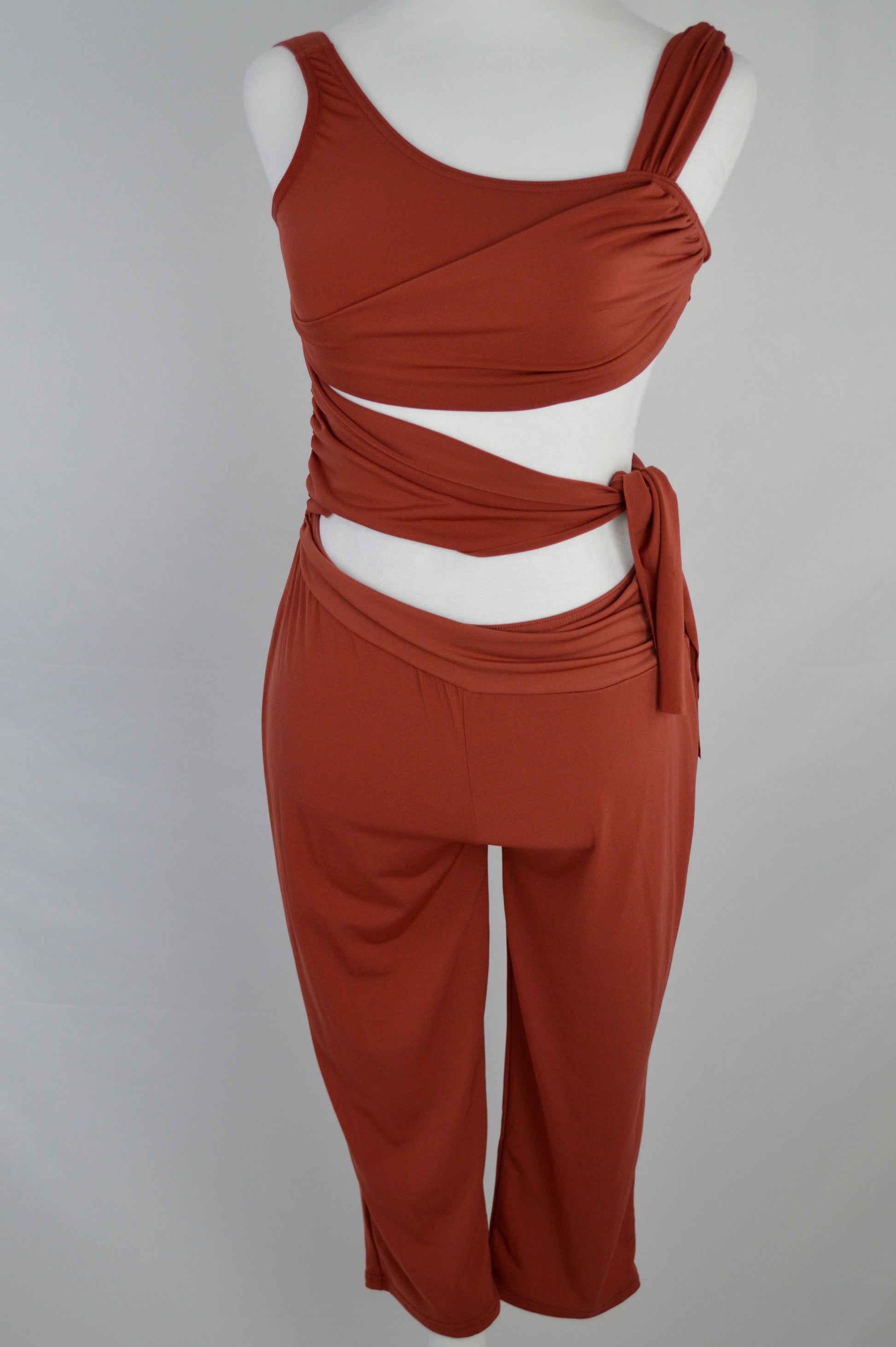 - asymmetrical one-piece, rust-colored, sleeveless jumpsuit