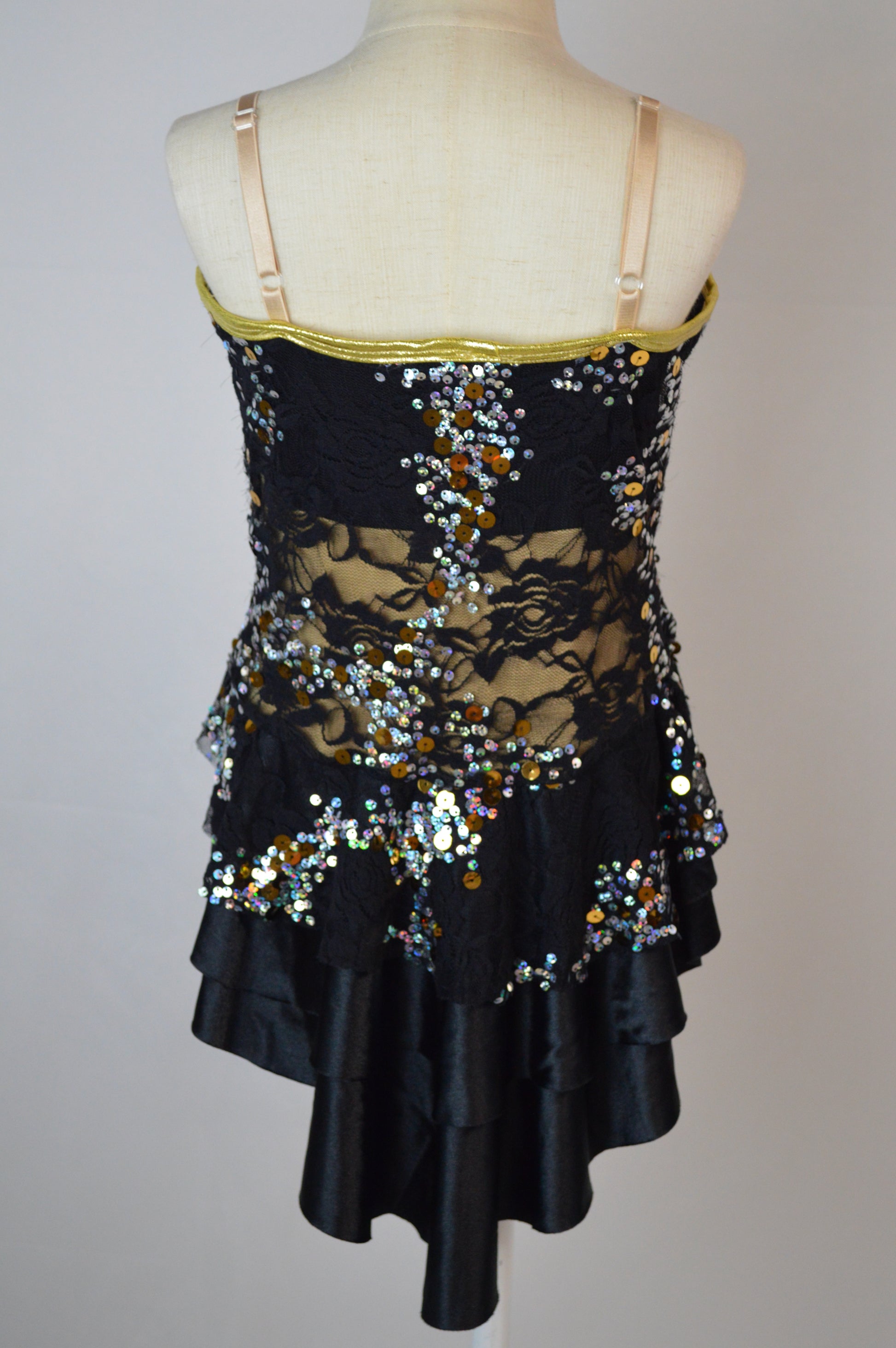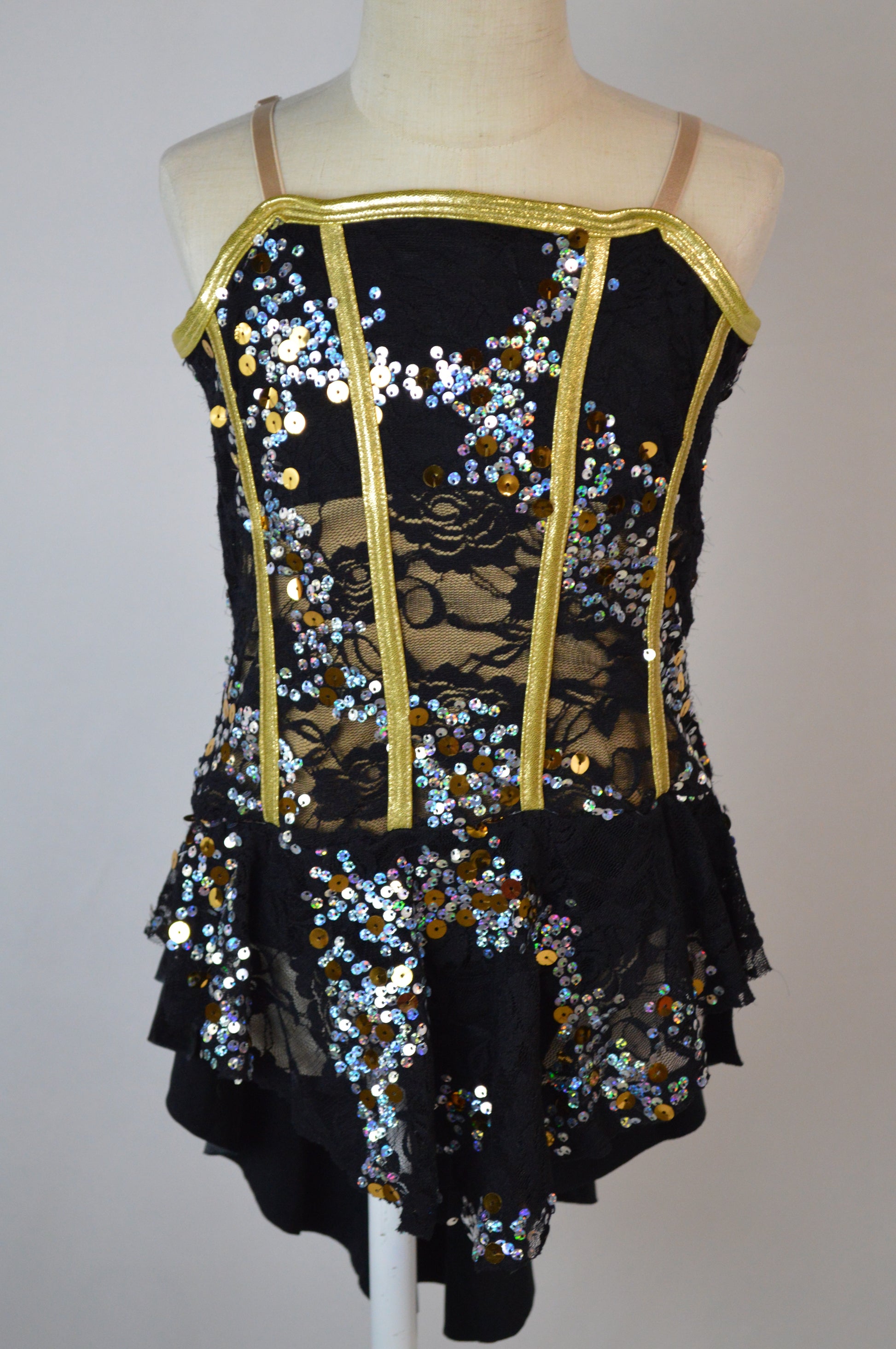 - gold foil dot cage details and trim on bodice