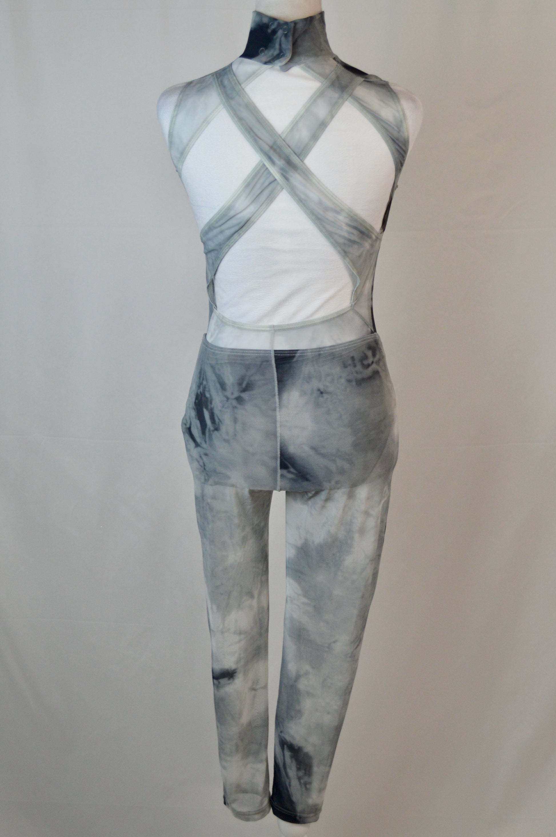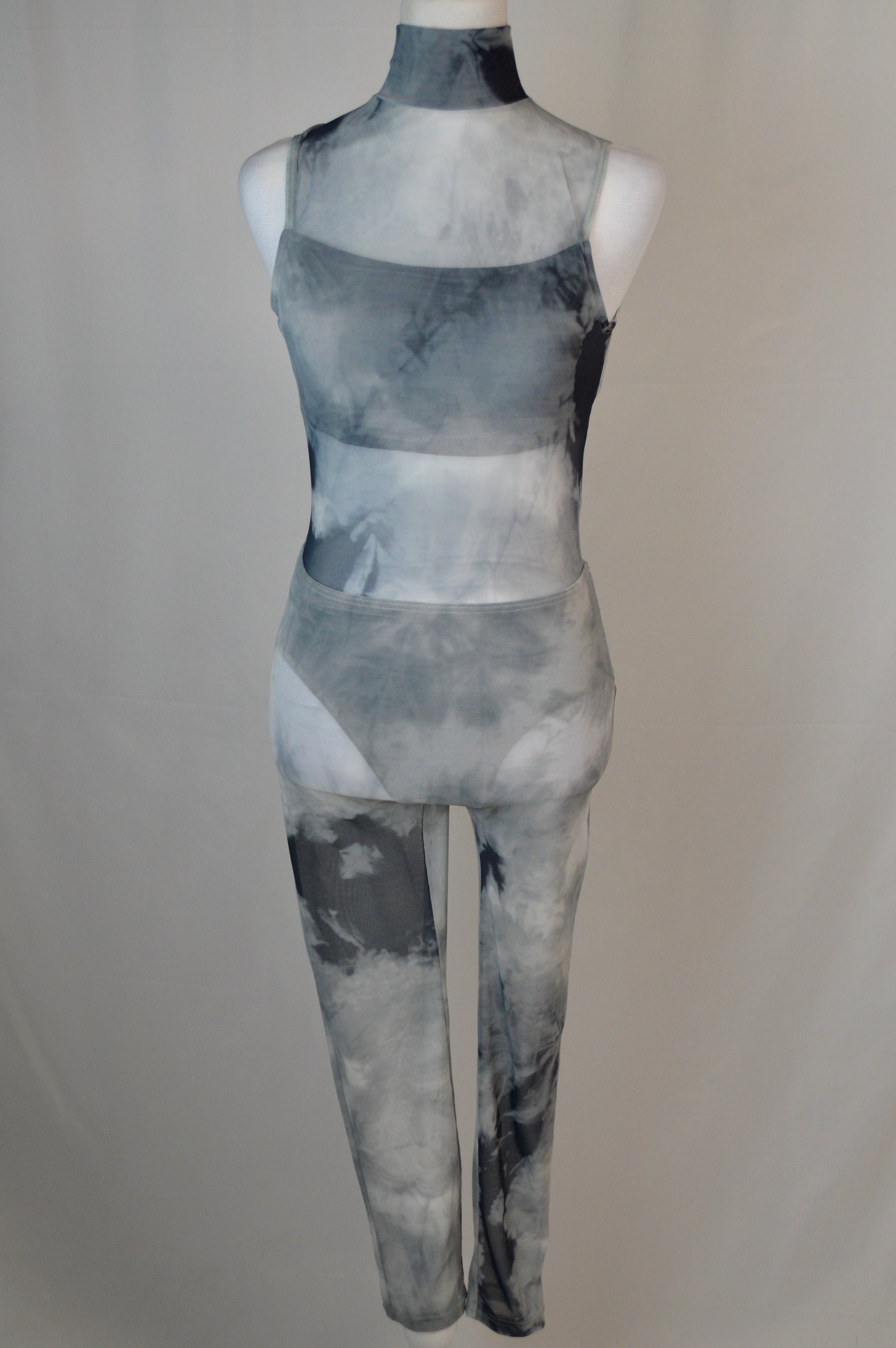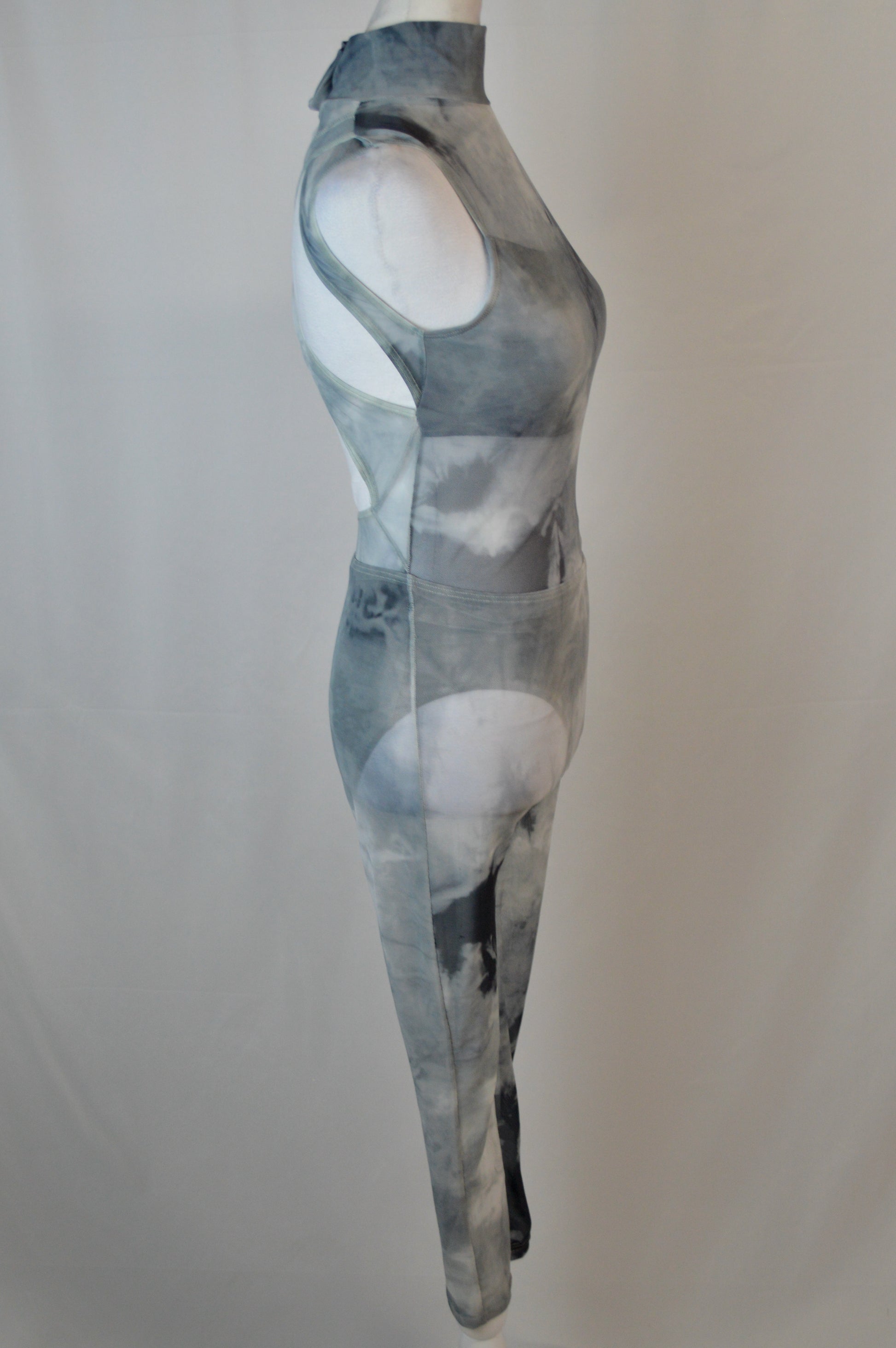 - unitard with smoke-effect mesh overlay