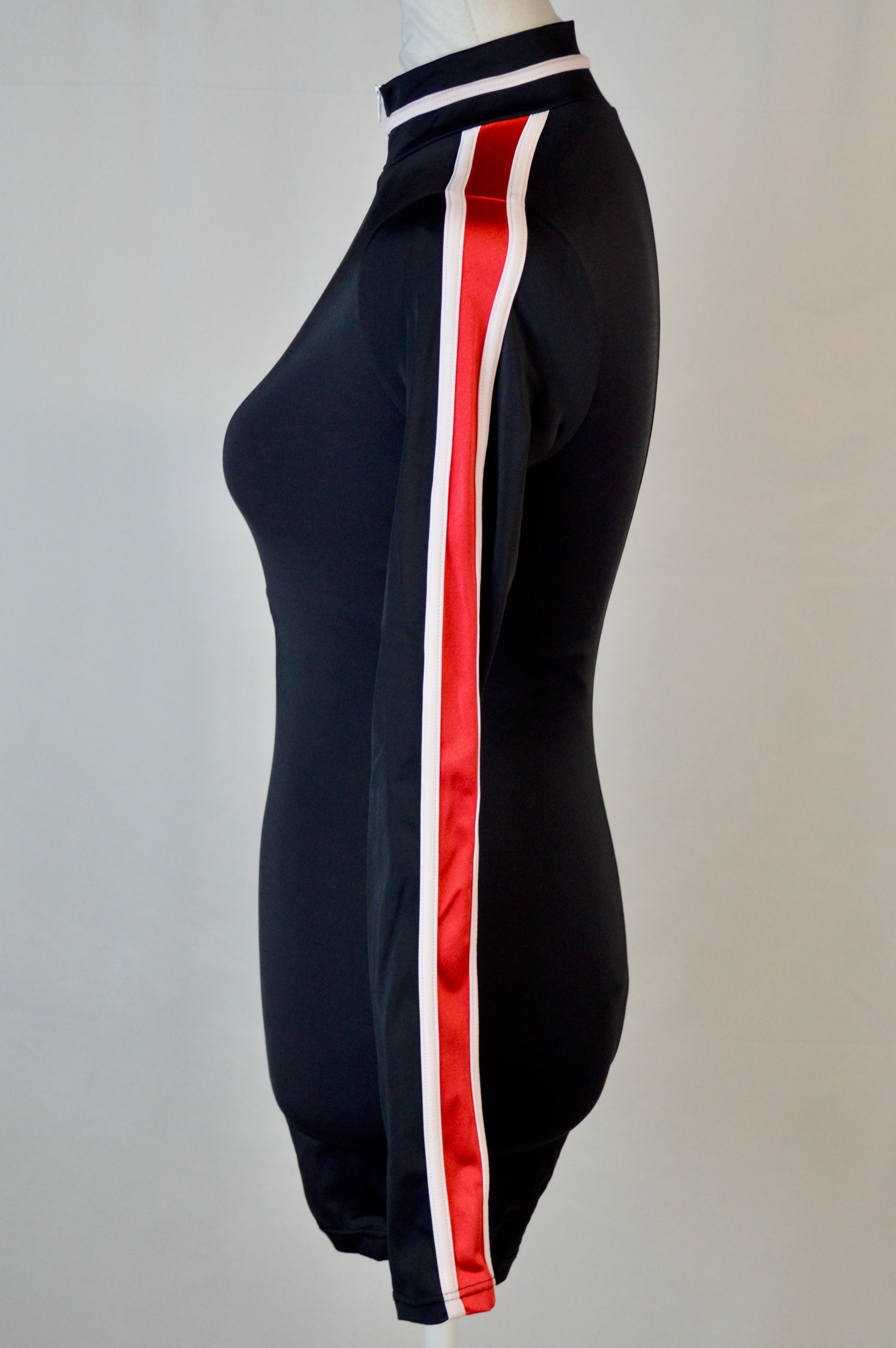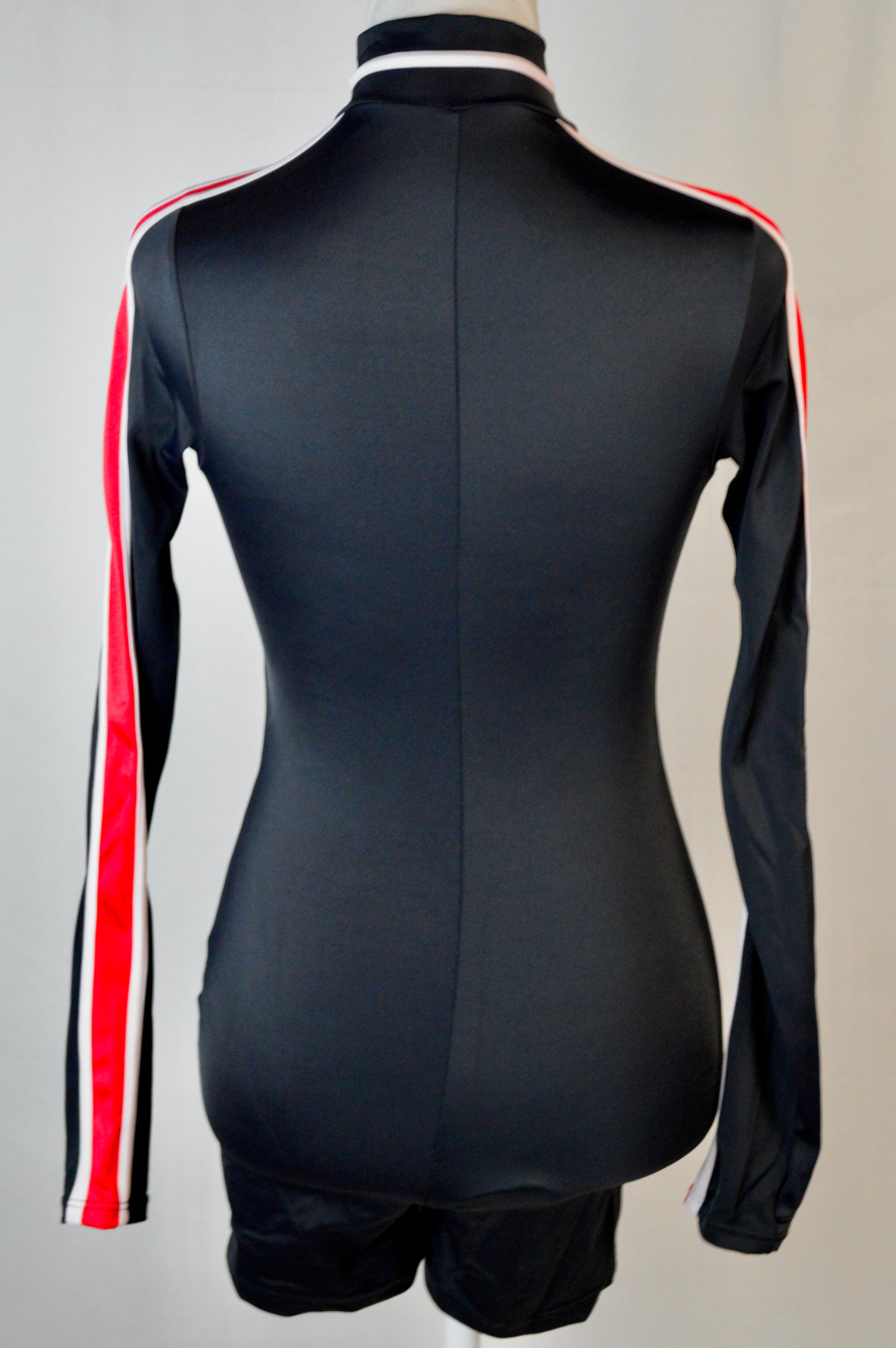 - contrast color stripes at the mock neck and sleeves