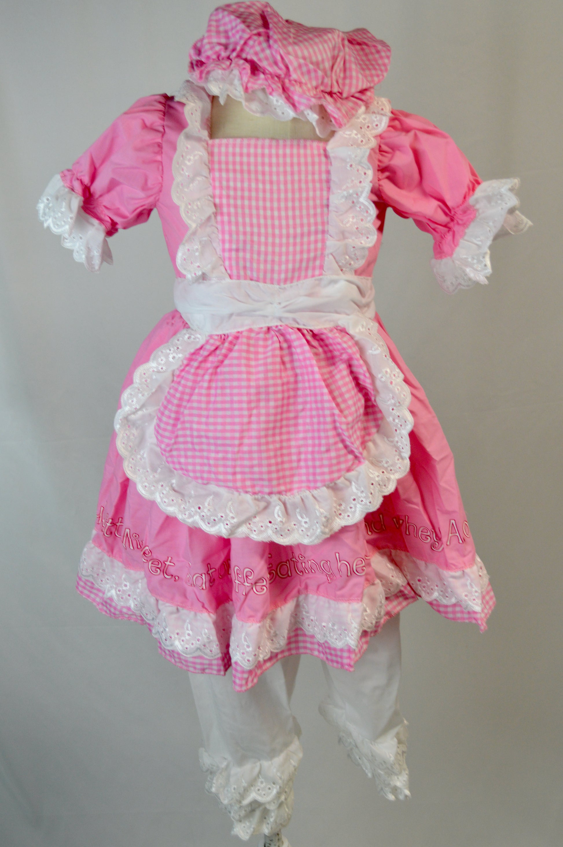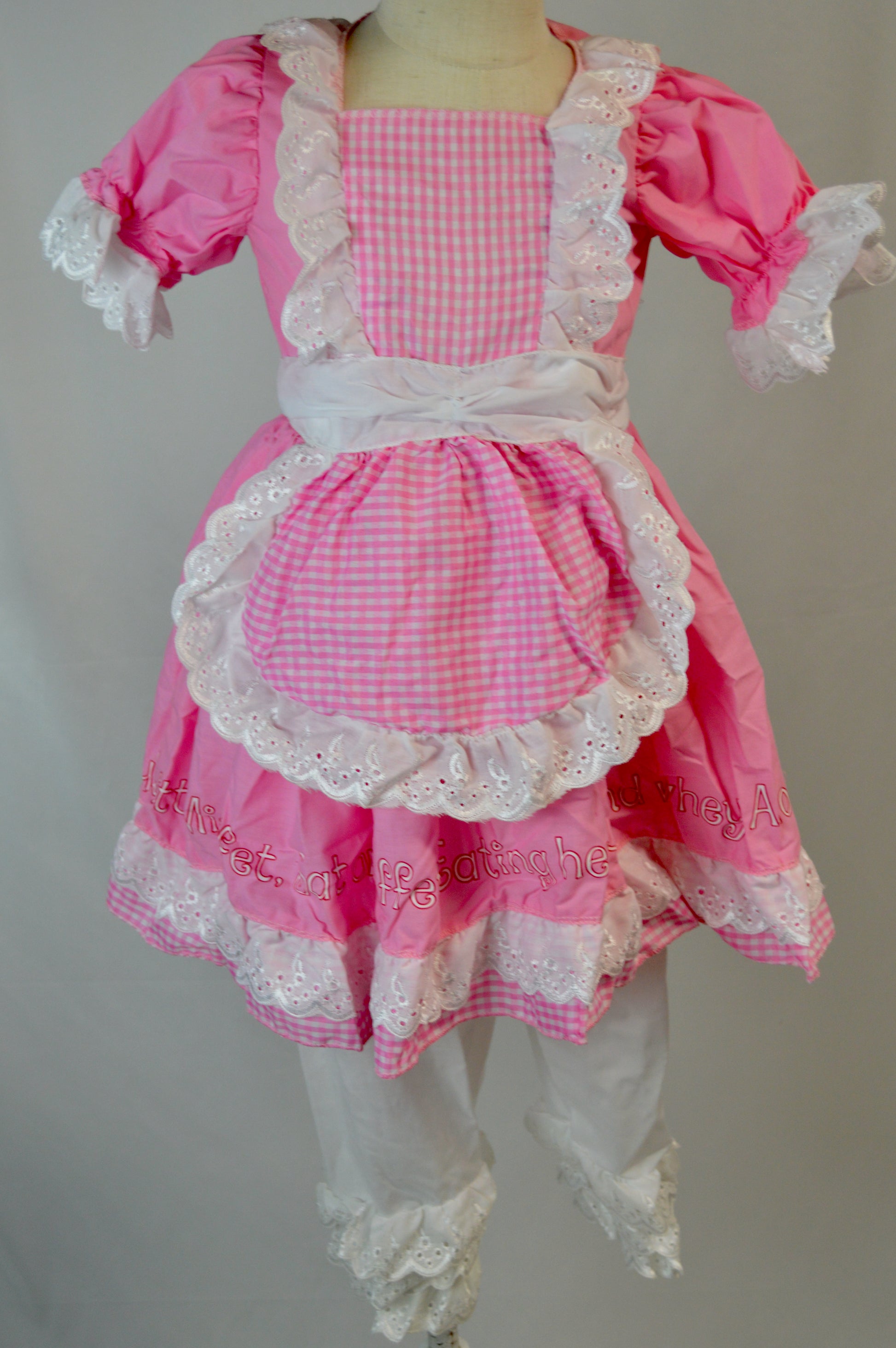 - "Little Miss Muffet sat on a tuffet" words around bottom of skirt