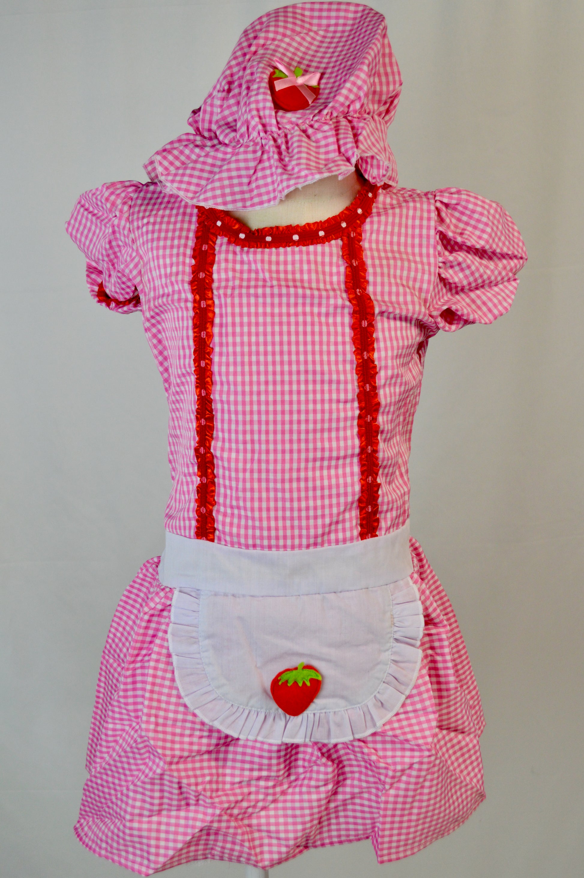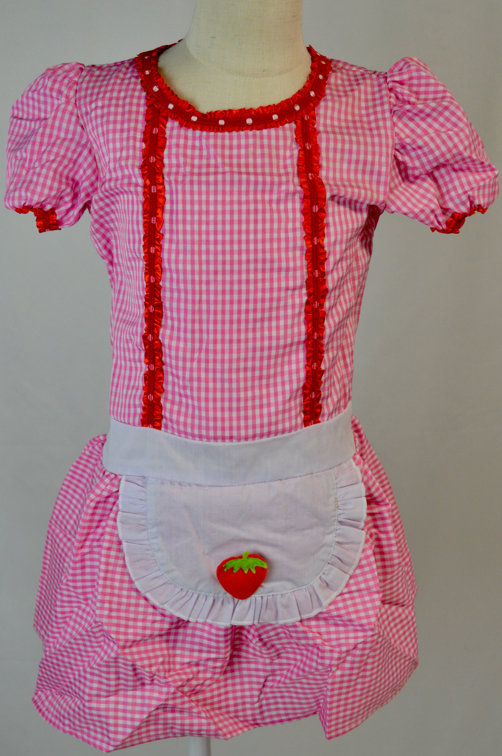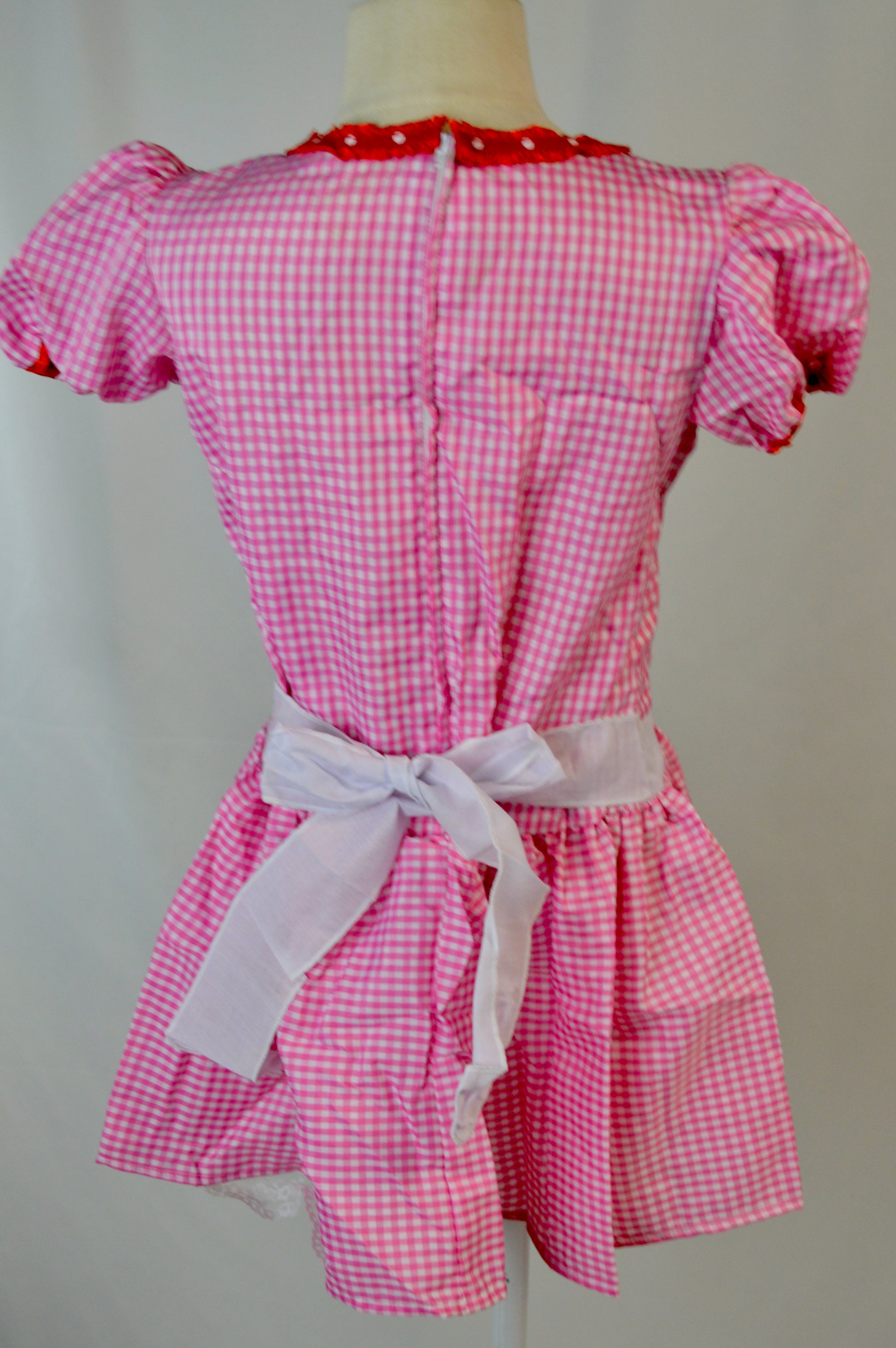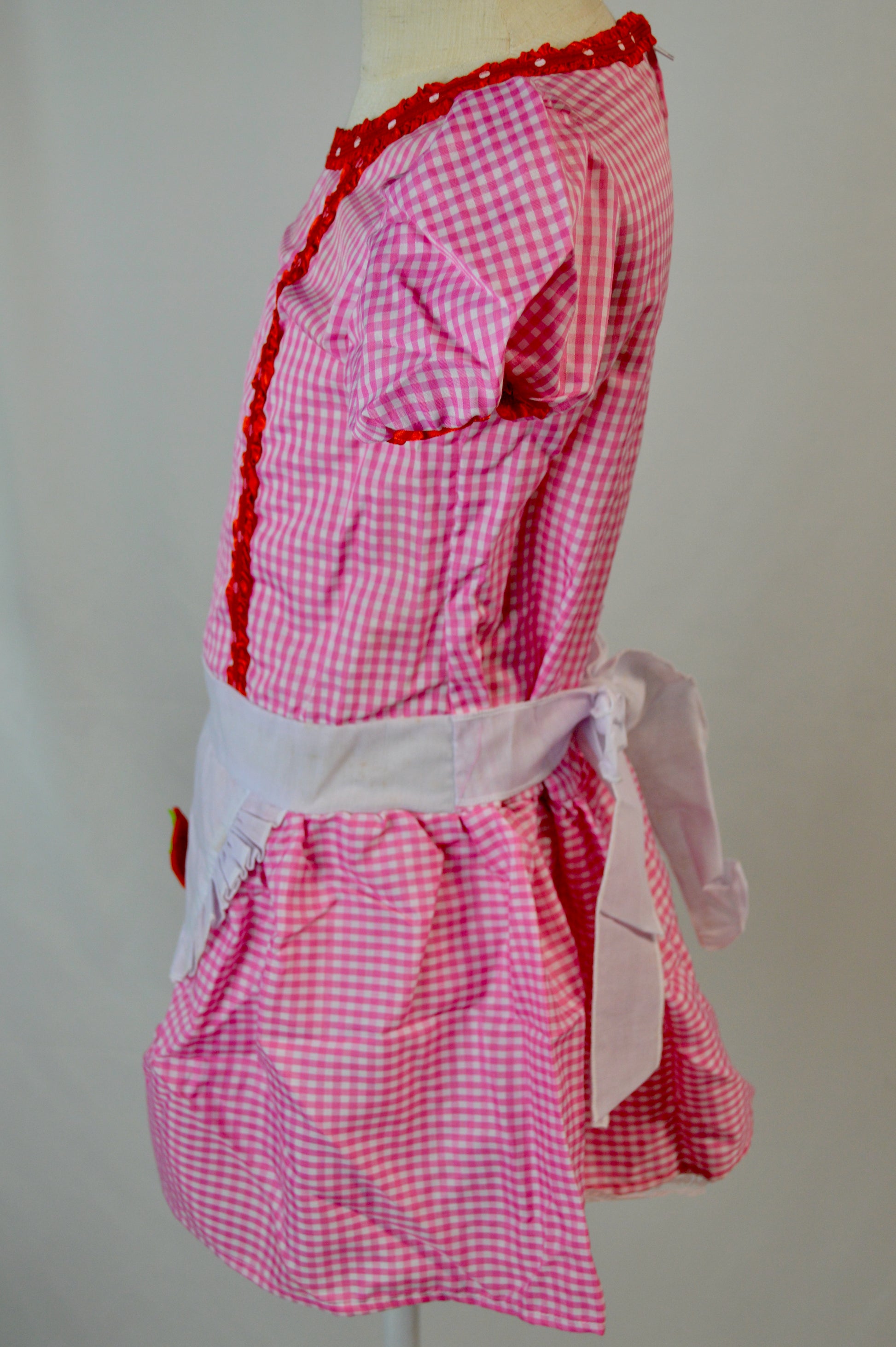 - pink and white gingham dress with red trim